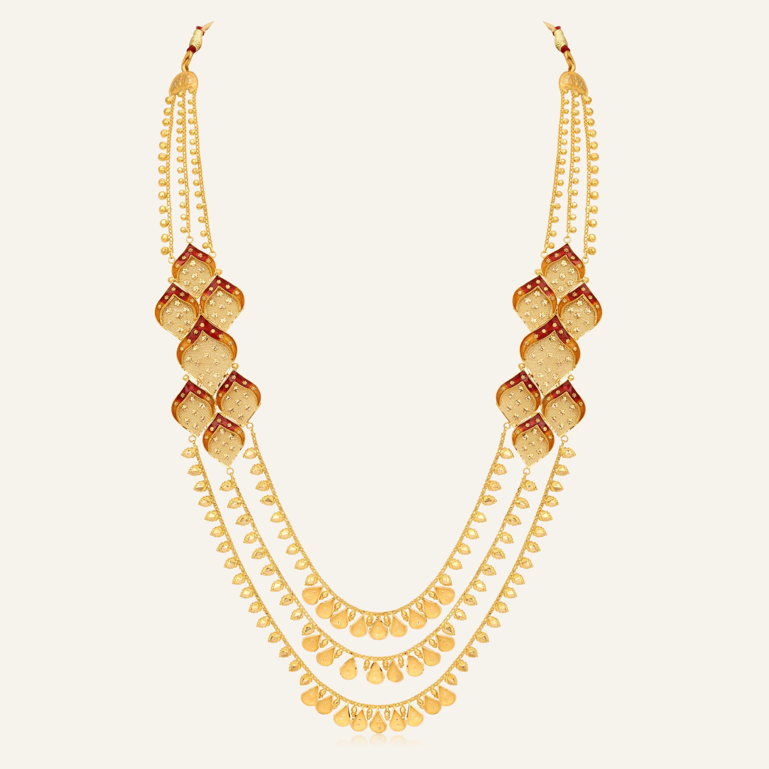 A truly unique piece with red and gold meenakari –the ‘khami’ or main pieces on the sides are inspired from the arches of the most beautiful Hindu temples.