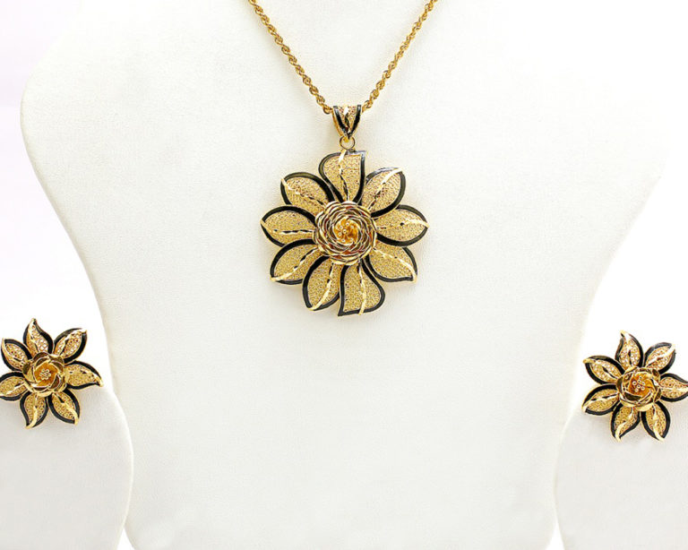 Another reason to thank Mother Nature: the beautiful Dalia, woven here with 22K gold and black meena! The weights given are inclusive of earrings that come with the pendant.