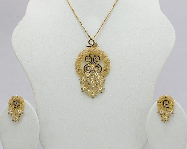 With a gorgeous play of black and white meena, the Bouquet Pendant Set is a very popular choice across the age range! The weights given are inclusive of earrings that come with the pendant.