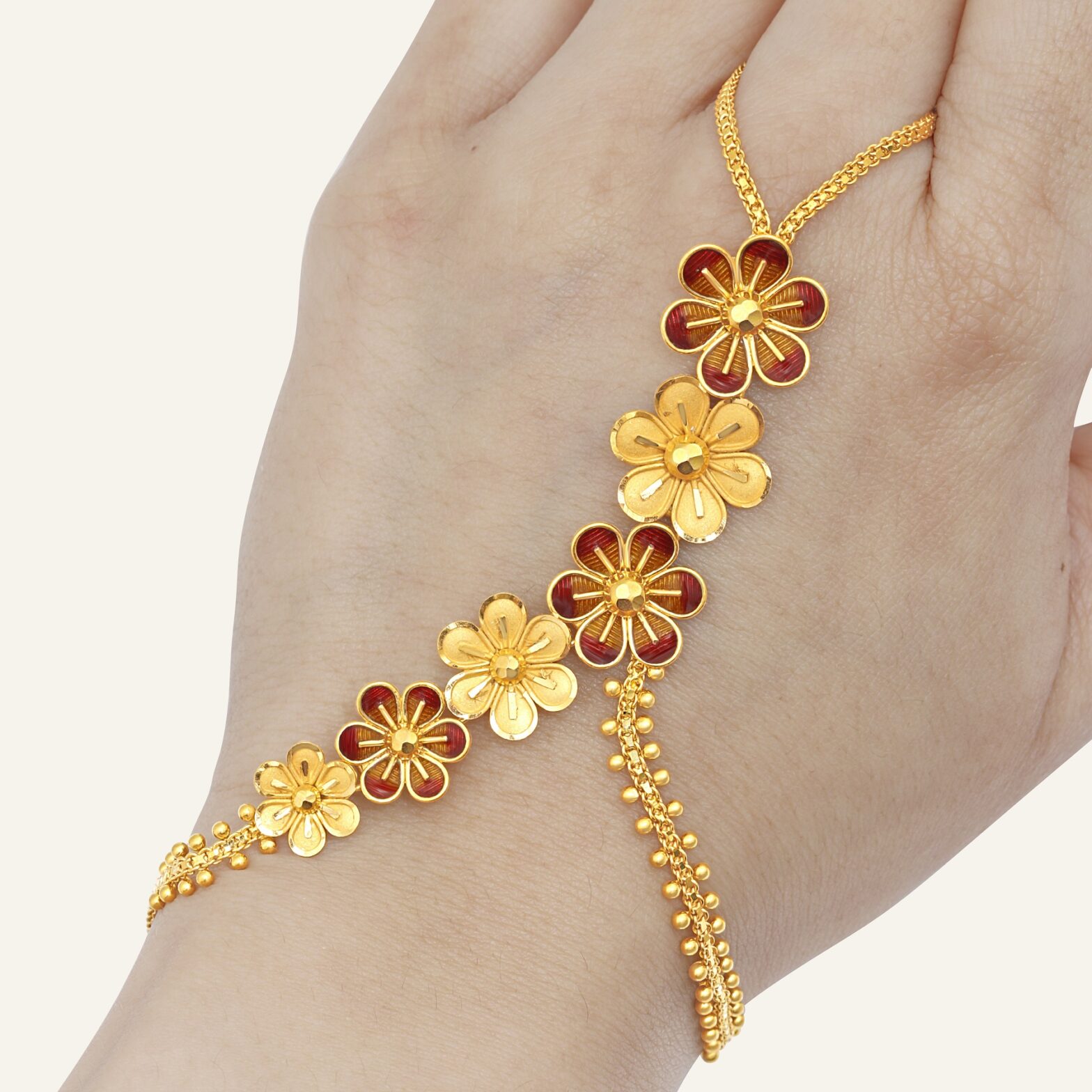 A beautiful play of Meenakari and Gold, this hand bracelet is a top favourite among our patrons.